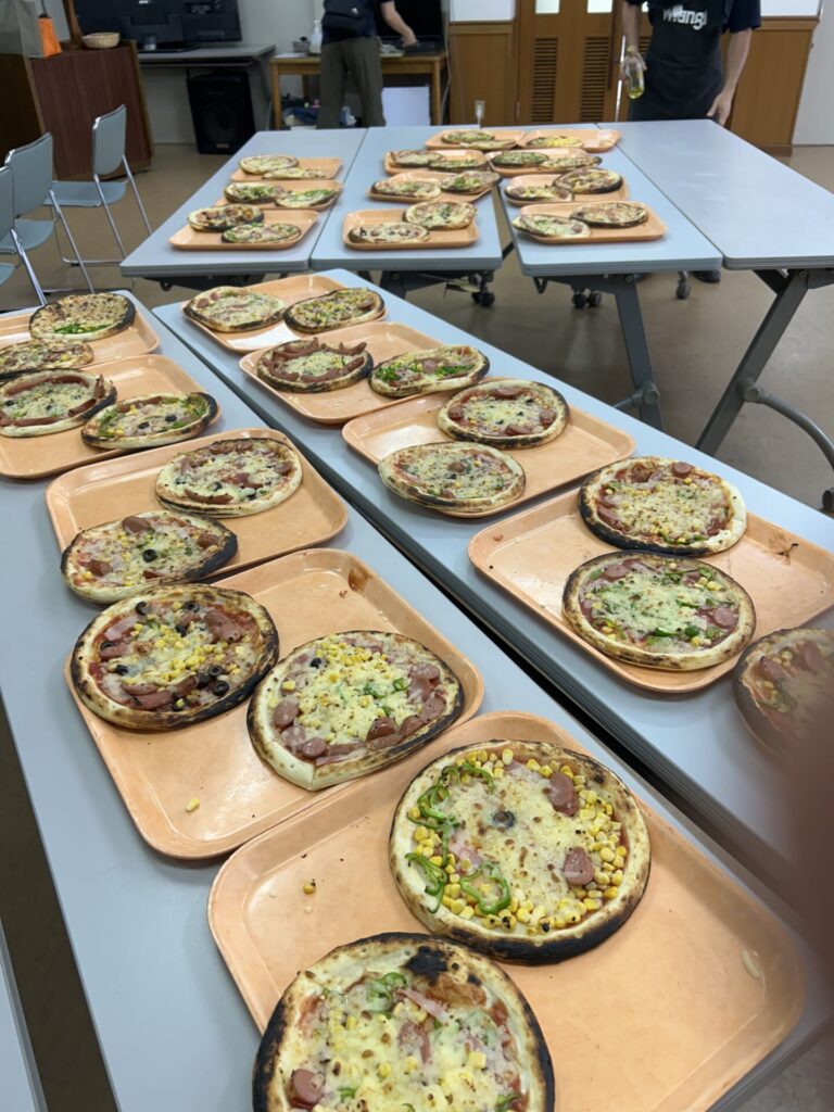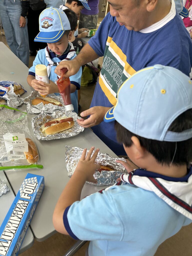 カートンドッグを焼いた後、カブ隊で用意してくれたピザ、焼きそばと一緒にお昼ご飯です
