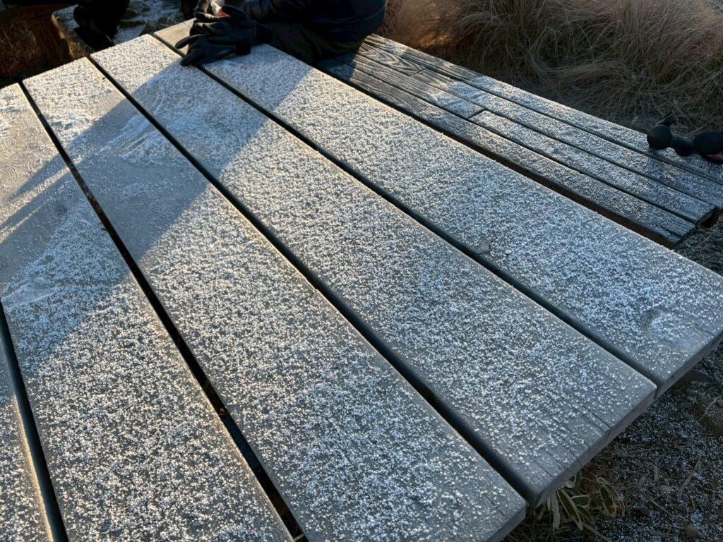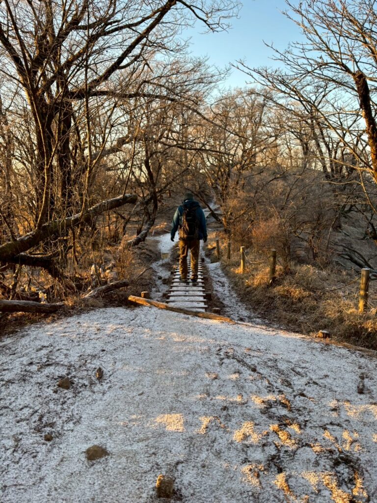 登山中には雪も降って来て、登山道にもうっすらと積もります。